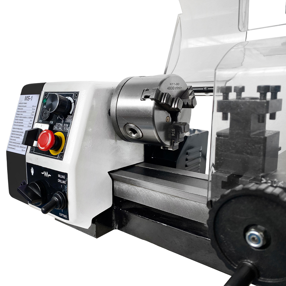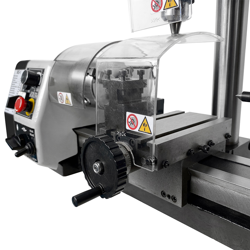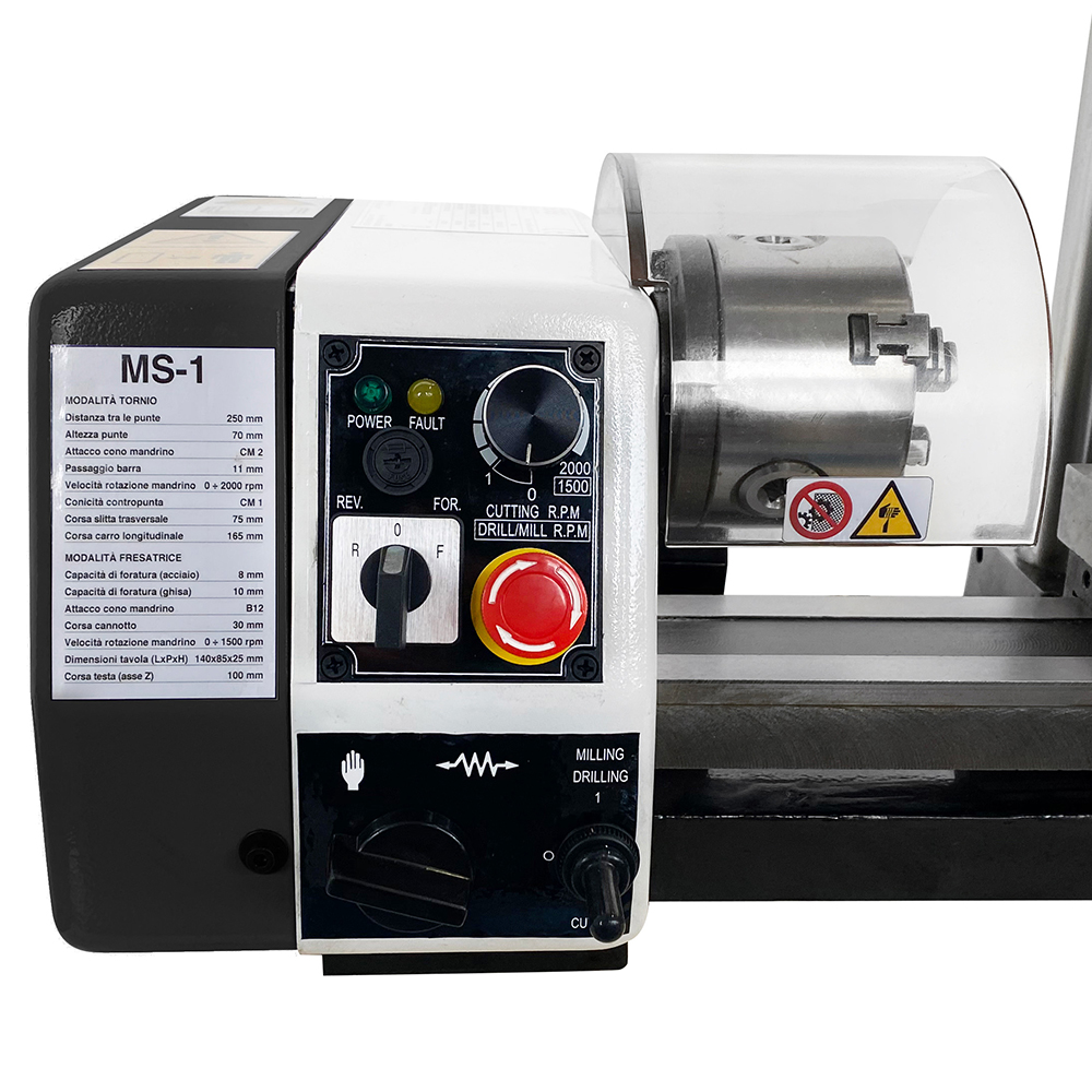 In accordo con la normativa vigente in materia di sicurezza, il tornio-fresa per metalli SOGI MS-1 è corredato di tutti i dispositivi di protezione necessari a preservare la salute dell'operatore e dell'ambiente circostante: schermi protettivi in policarbonato mobili (di cui uno interbloccato) e fissi, interruttore di emergenza.