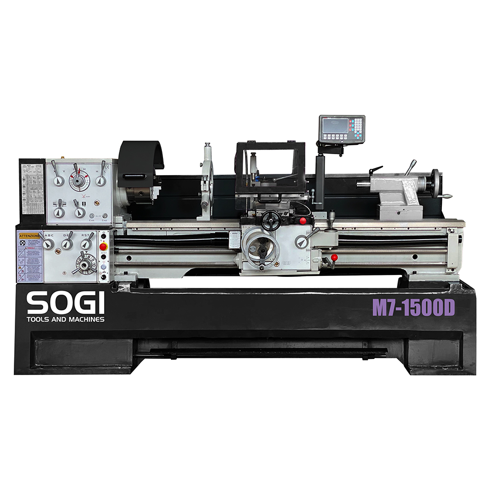 Il tornio parallelo SOGI M7-1500D è una macchina utensile professionale, dalle linee tradizionali, progettata per la lavorazione di materiali metallici, leghe derivate e molto altro in grado di effettuare torniture (sia coniche che cilindriche), filettature (sia Metriche che Whitworth), forature, alesature, profilature ecc.