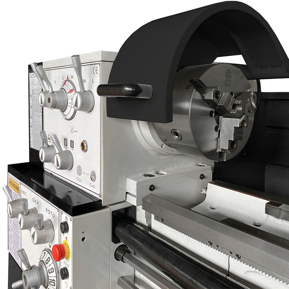 Il mandrino, autocentrante con griffe diritte, rovesce e tenere in dotazione, ha un diametro di Ø 250 mm ed ha un attacco Camlock che assicura un corretto e pratico centraggio rispetto all'asse mandrino. L'albero mandrino è montato su cuscinetti a rulli conici regolabili di alta qualità ed è in bagno d'olio. Il mandrino è azionato da un motore asincrono trifase robusto ed affidabile.