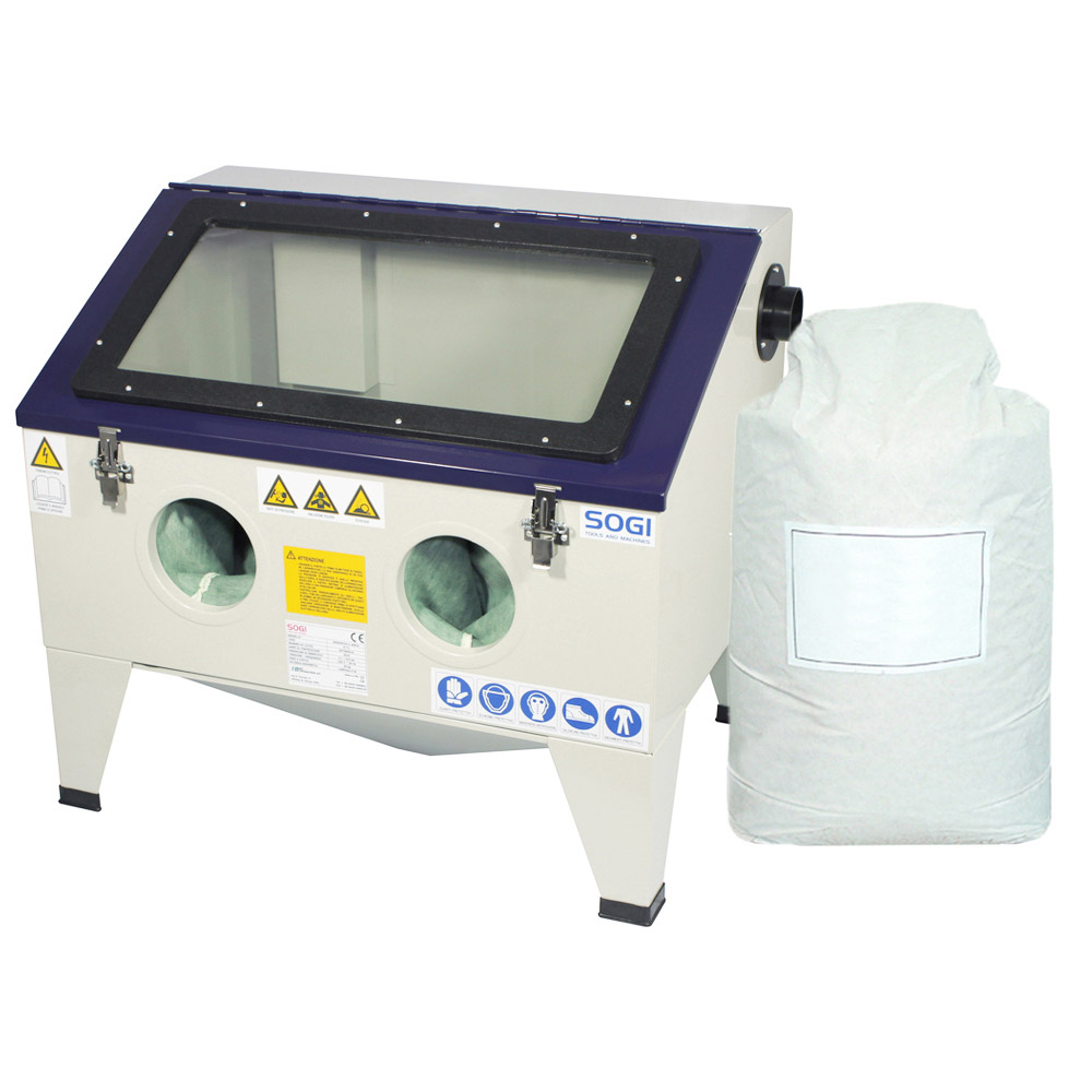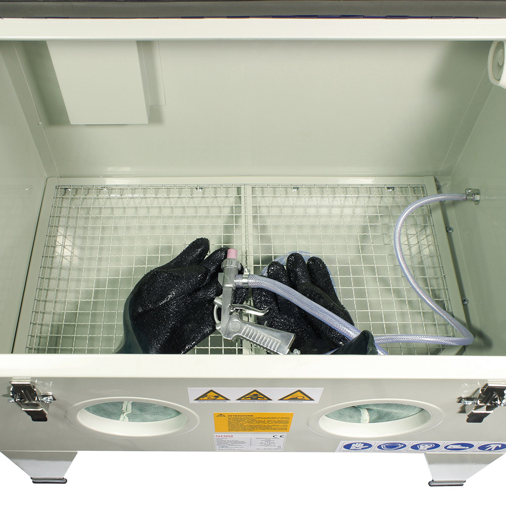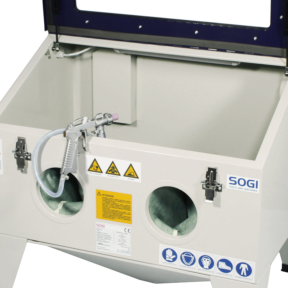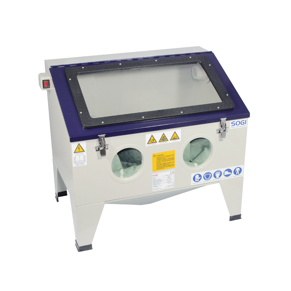 La sabbiatrice da banco SOGI S-72 è in grado di sabbiare, pulire e satinare le superfici metalliche, tramite un flusso in pressione di particelle abrasive secche, come microsfere di vetro o corindone. Nella lavorazione può presentare diversi gradi di finitura, variando la granulometria delle particelle abrasive e del tipo di particolari da lavorare, come pezzi in legno, motori, pezzi meccanici e altri metalli, plastiche etc.