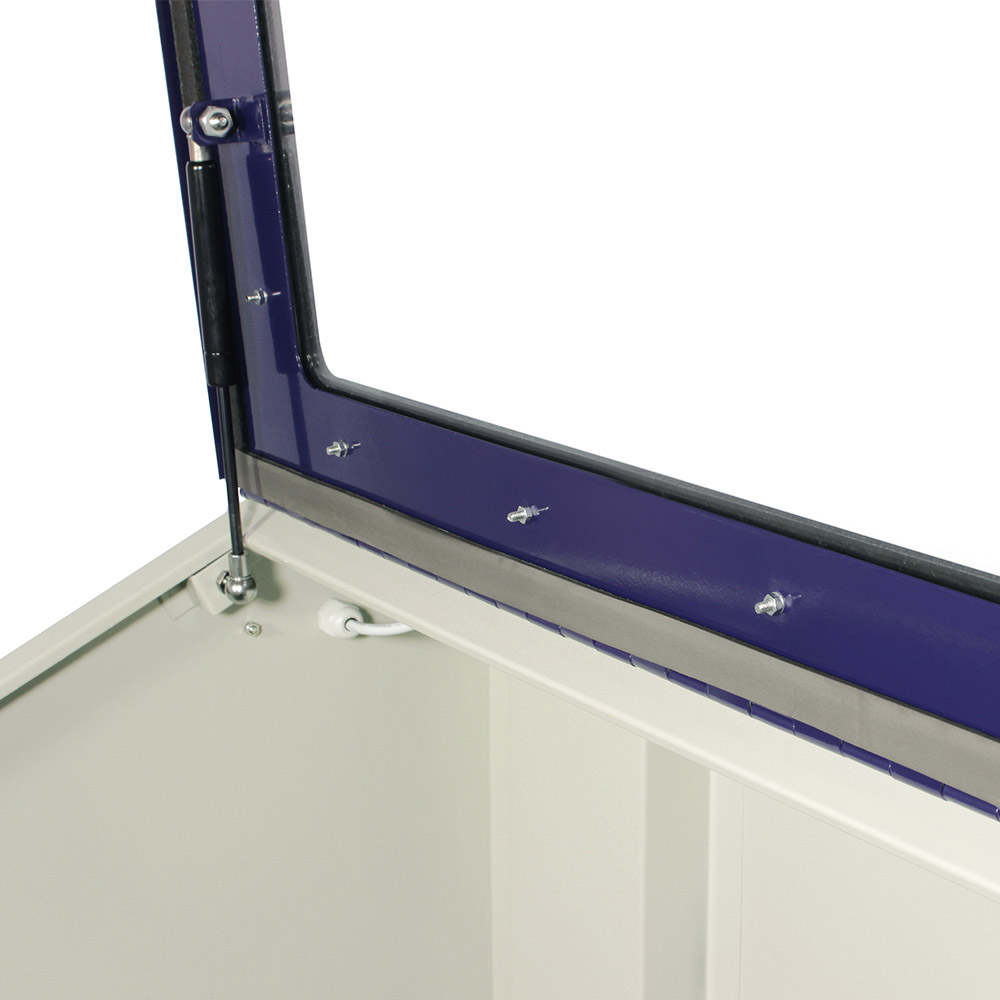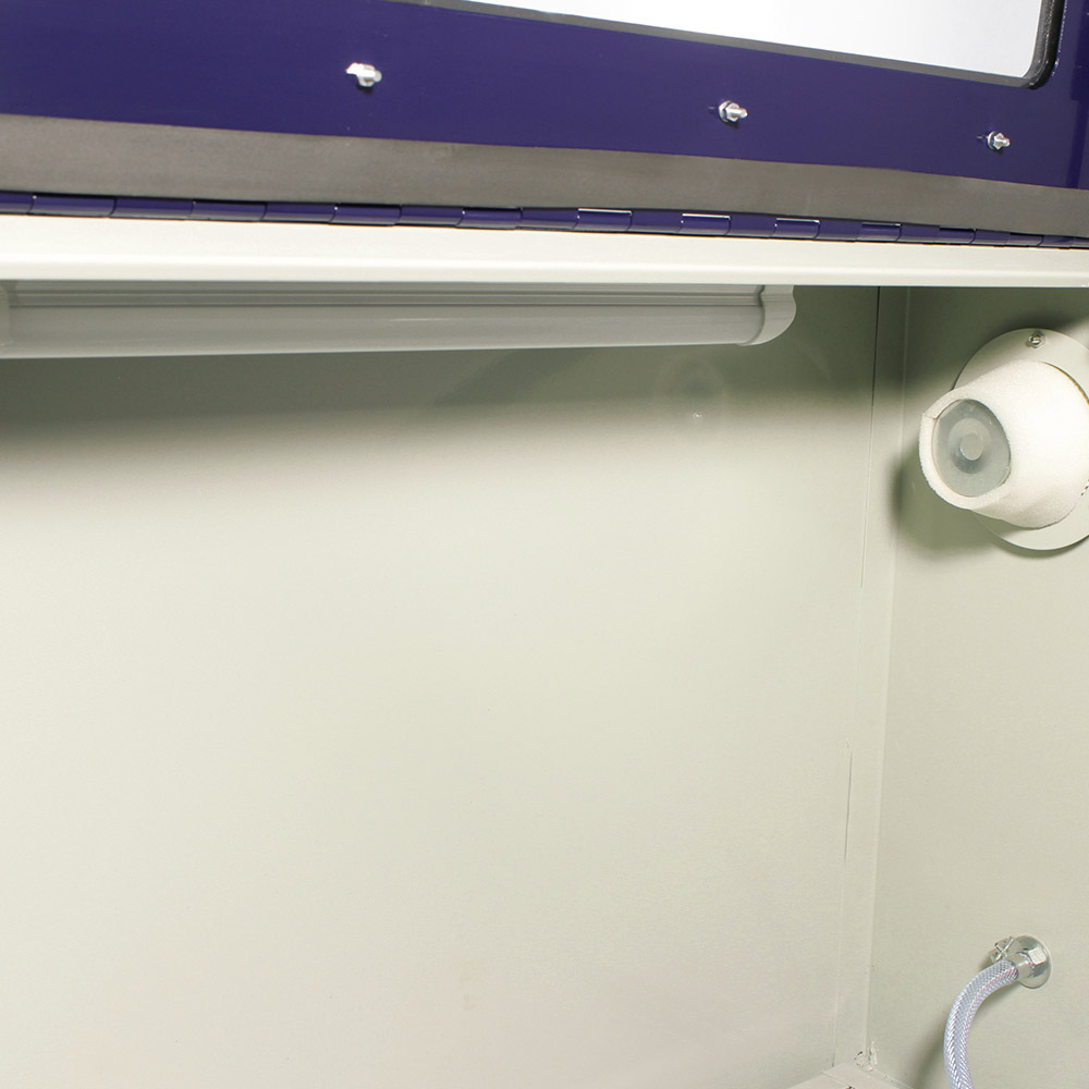 Comodo e pratico pannello frontale in vetro per la verifica del proprio operato attraverso lo schermo posto sopra la macchina con impianto di illuminazione. Per introdurre il pezzo da lavorare in questo modello basta sollevare la parte superiore attuata da due ammortizzatori a gas. Dotata di filtro aspirazione con predisposizione per aspiratore.
