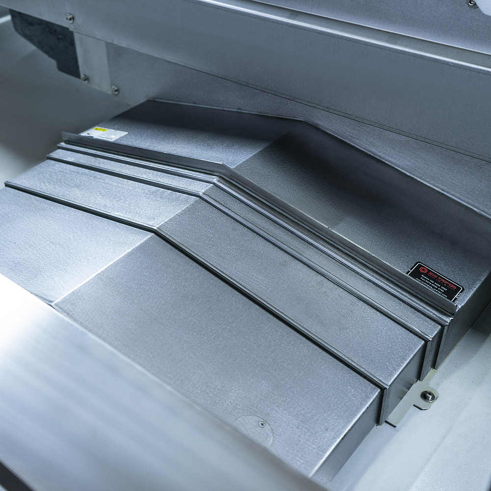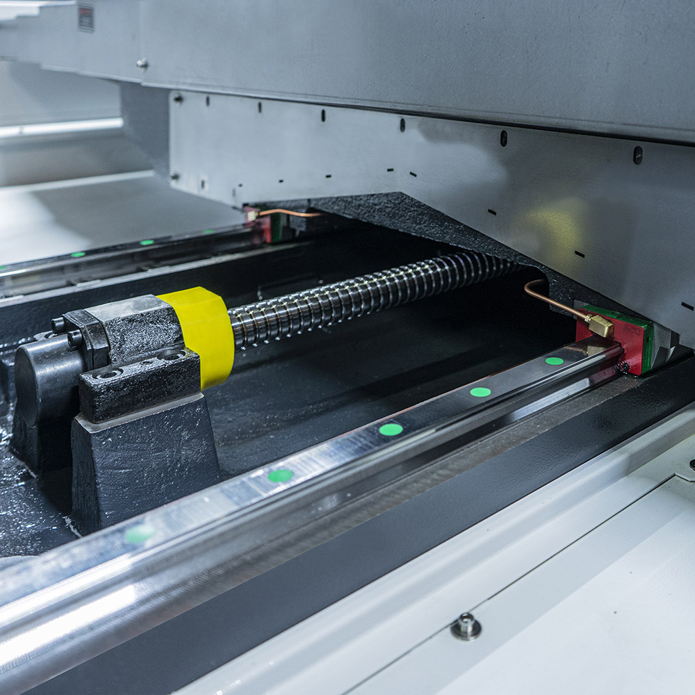 • Tavola e gruppo testa che scorrono su guide lineari rettificate di fattura taiwanese, con pattini a ricircolo di sfere.