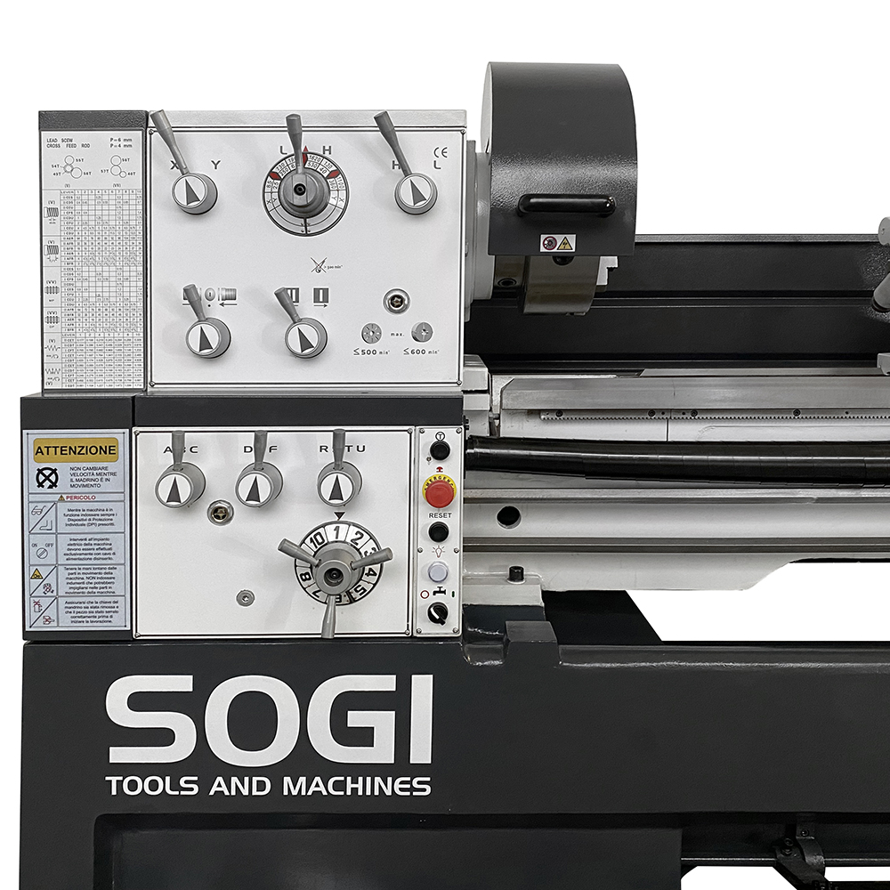 Il tornio per metalli SOGI M8-2000D vanta una scatola ingranaggi Semi-Norton, ideale per l'esecuzione della quasi totalità dei passi della filettatura (per i restanti, è sufficiente sostituire solo pochi ingranaggi). Gli ingranaggi sono in acciaio temprato e rettificato al fine di migliorare la resistenza all'usura ed a fatica.