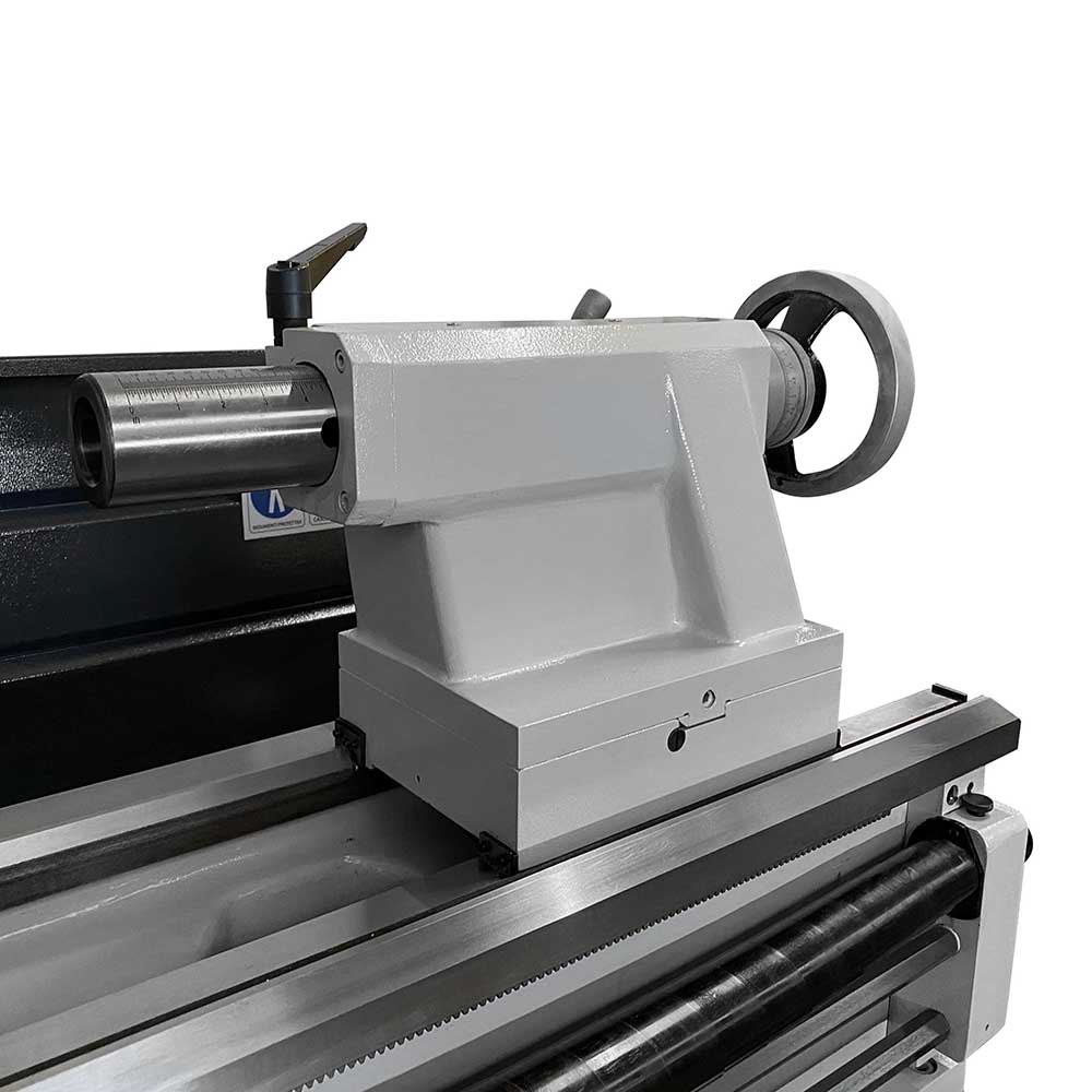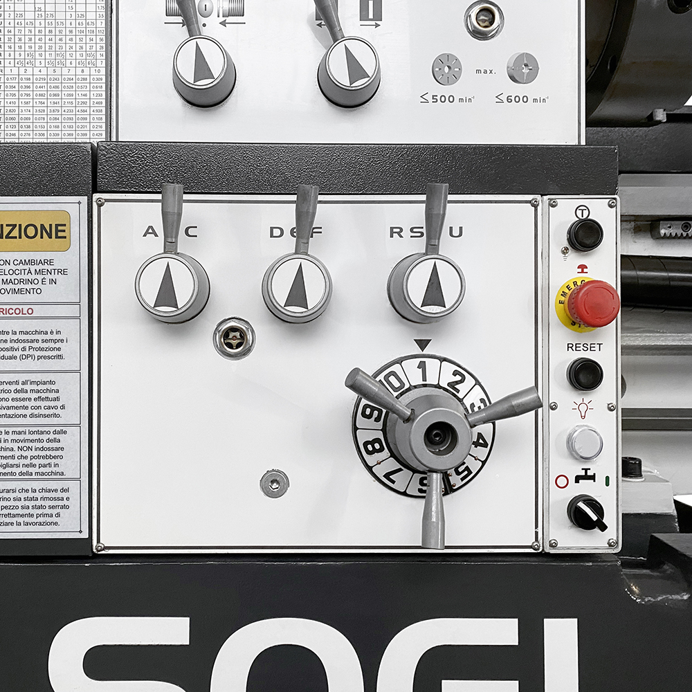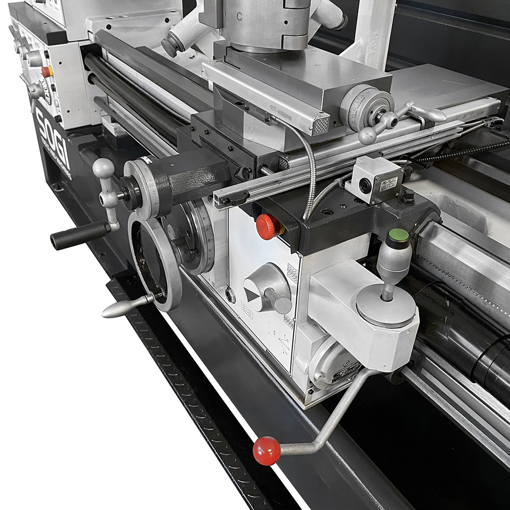 Il tornio industriale SOGI M8-2000D ha avanzamenti longitudinali e trasversali automatici per l'esecuzione sistematica della lavorazione: un joystick progettato ad hoc comanda l'avanzamento di lavoro/rapido del carro e della slitta trasversale. La controtesta è facilmente regolabile per torniture coniche e il cannotto consente l'avanzamento della contropunta tramite apposito volantino con nonio graduato. La torretta Multifix a cambio rapido permette una regolazione dell'altezza dell'utensile garantendone un preciso allineamento con l'asse mandrino.