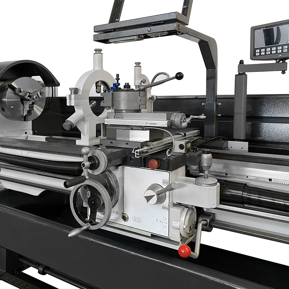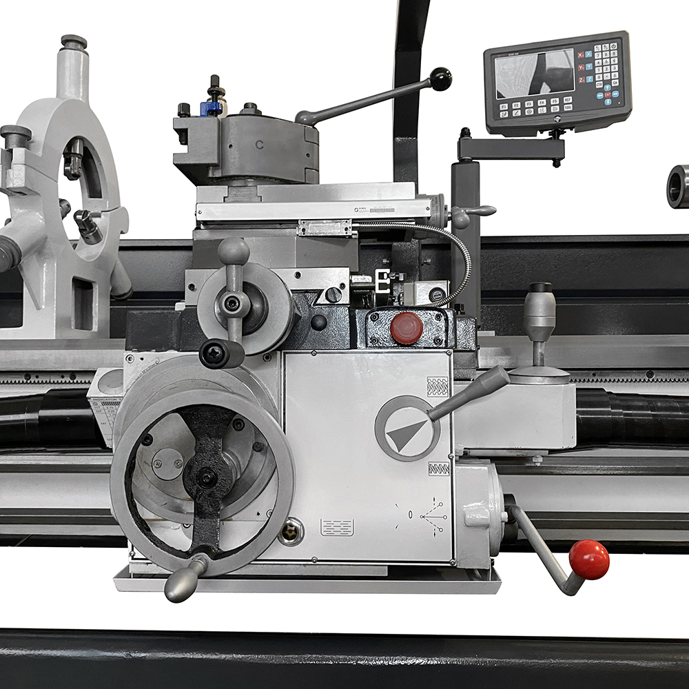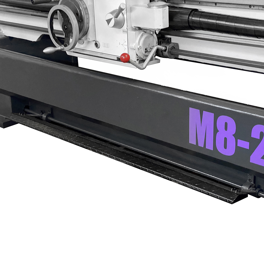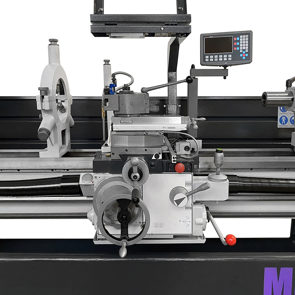 Il tornio industriale SOGI M8-2000D ha avanzamenti longitudinali e trasversali automatici per l'esecuzione sistematica della lavorazione: un joystick progettato ad hoc comanda l'avanzamento di lavoro/rapido del carro e della slitta trasversale. La controtesta è facilmente regolabile per torniture coniche e il cannotto consente l'avanzamento della contropunta tramite apposito volantino con nonio graduato. La torretta Multifix a cambio rapido permette una regolazione dell'altezza dell'utensile garantendone un preciso allineamento con l'asse mandrino.