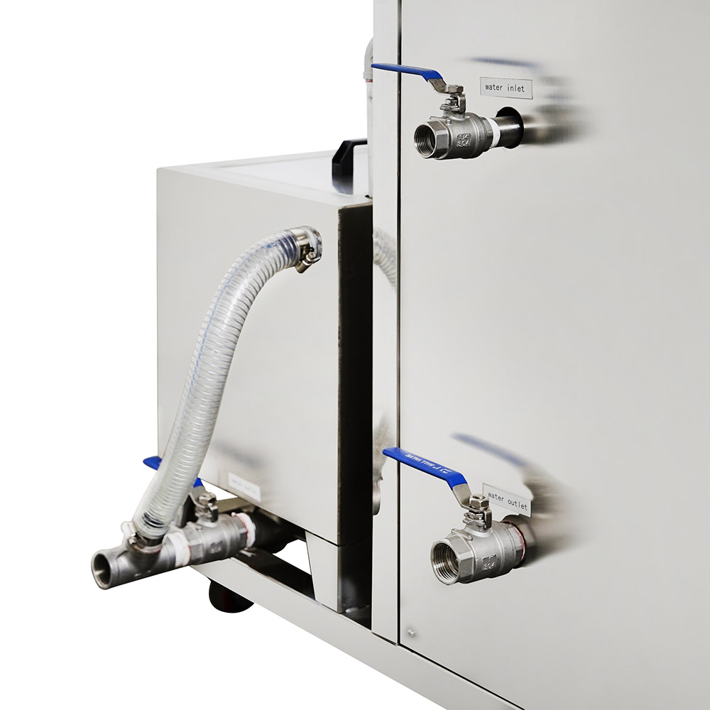L’utilizzo della vasca è facile ed intuitivo grazie al pratico pannello frontale che comanda sia il termostato responsabile dell’incremento della temperatura che la messa in funzione del sistema di depurazione. È presente anche un timer dotato di schermo LCD per impostare la durata dei cicli di lavaggio. Separatamente, è fornito il generatore a controllo dei trasduttori, così da poter gestire in totale autonomia l’avviamento, la potenza e la frequenza delle onde ultrasoniche. Quest’ultimo è dotato di ventola a garanzia di un corretto raffreddamento dei sistemi di comando.