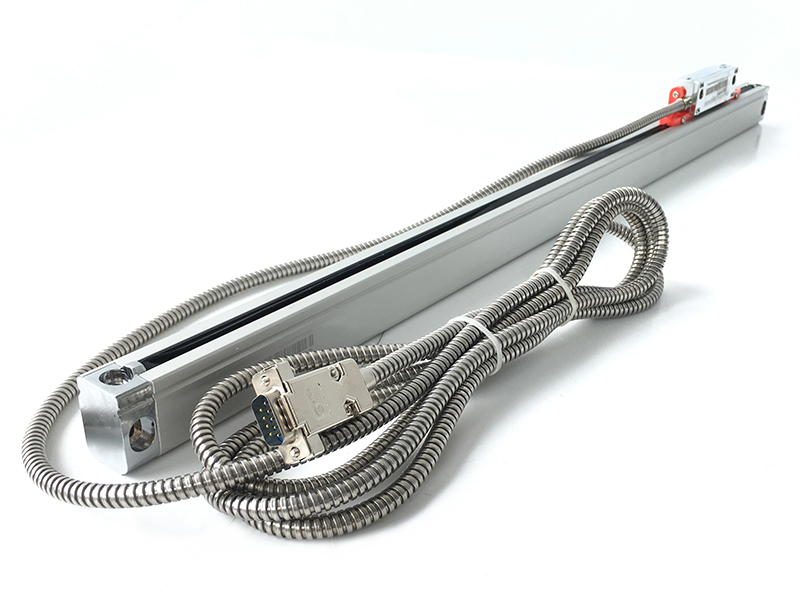 Nei modelli di righe ottiche con lettura a trasparenza, gli emettitori emmettono un fascio infrarosso che passando attraverso un collimatore e una riga di vetro graduata colpisce i fototransistor, creando segnali sinusoidali proporzionati al passo della gradazione.
