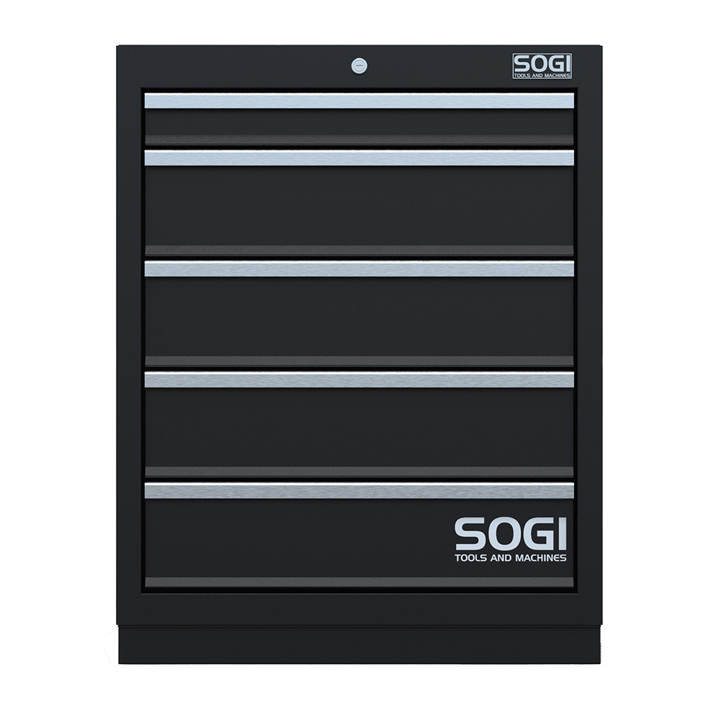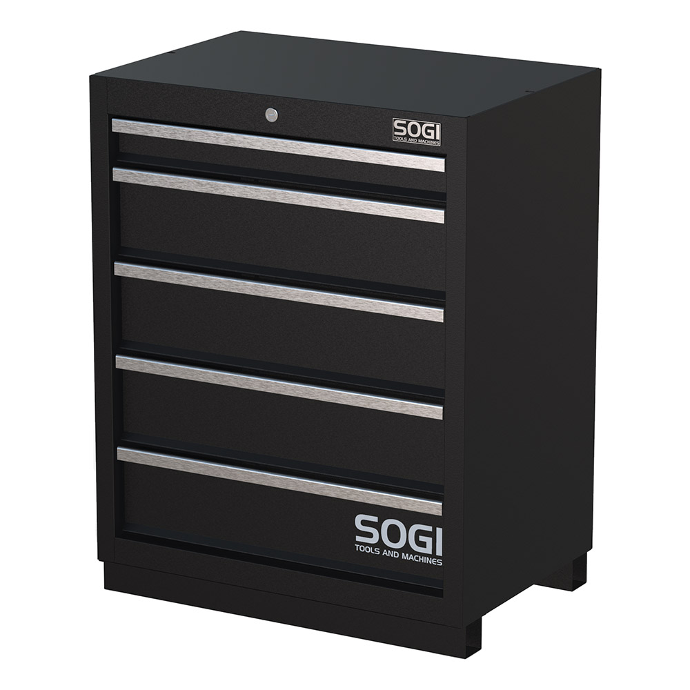 Realizzato in lamiera di acciaio verniciata a polveri, l'armadietto basso SOGI ARR-M-A-5C ha cinque cassetti antiribaltamento, uno meno capiente per attrezzi più piccoli, quattro di dimensioni più generose. La portata del singolo cassetto è di 35 kg. La loro estrazione è telescopica: i cassetti, infatti, scorrono lungo guide singole di spessore 35 mm con cuscinetti a sfere. In tal modo, sarà possibile tirare completamente fuori il singolo cassetto per afferrare in modo agevole gli attrezzi di lavoro.