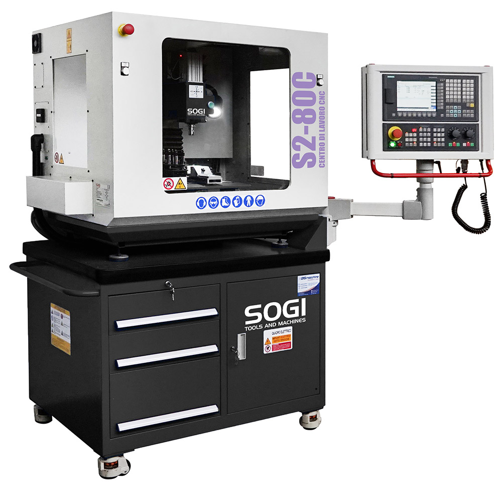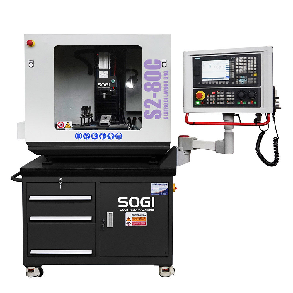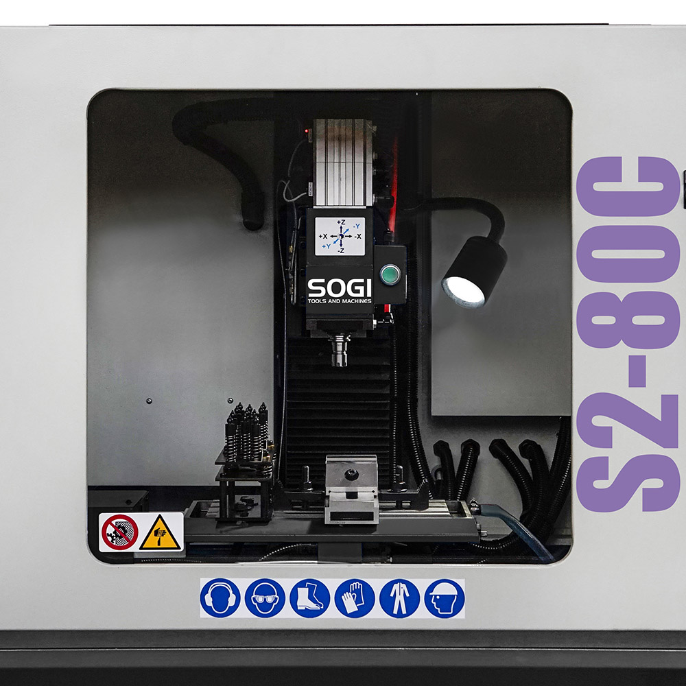 Il centro di lavoro verticale SOGI S2-80C è una macchina a controllo numerico compatta e intuitiva in grado di effettuare molteplici lavorazioni su materiali metallici e leghe derivate, materiali polimerici e molto altro, tra cui forature, fresature, alesature, contornature, maschiature ecc. Date le sue dimensioni contenute e l'indiscussa semplicità di utilizzo, è particolarmente indicata per un impiego didattico o per corsi di formazione.