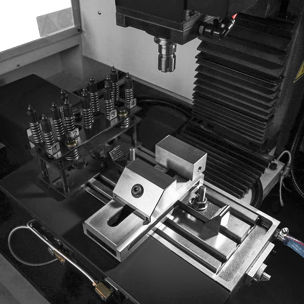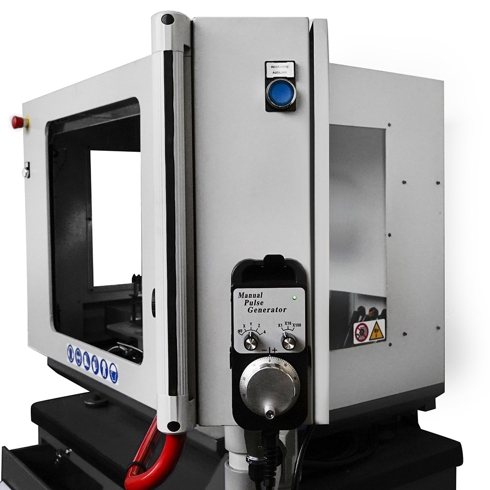 Il mandrino, con attacco ISO20, è azionato da un motore monofase da ben 1.0 kW che consente regimi di rotazione fino a 5000 giri/min con regolazione in continuo della velocità. Il magazzino del tipo pick-up ha 4 possibili postazioni per lo stoccaggio degli utensili necessari ad ultimare la lavorazione.