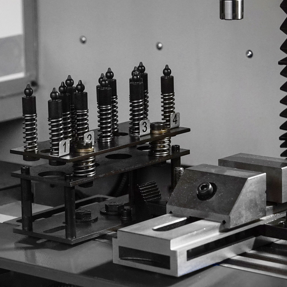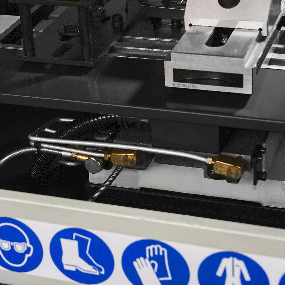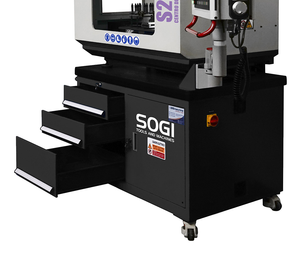 La macchina è equipaggiata di lampada LED ed impianto di lubrificazione ad azionamento manuale. Inoltre la macchina poggia su un basamento in lamiera mobile con tre cassetti dotati di chiusura centralizzata per stoccare attrezzi e utensili necessari alla lavorazione. Le quattro ruote pivotanti provviste di sistema frenante, insieme alla pratica ed ergonomica maniglia laterale, facilitano il trasporto della macchina da una zona all'altra. Impianto di lubrorefrigerazione opzionale.