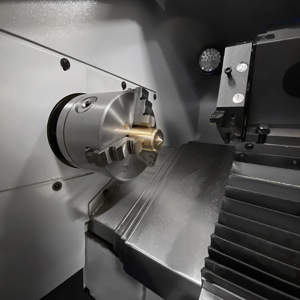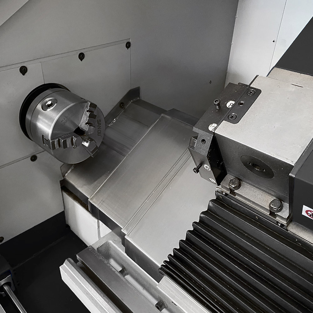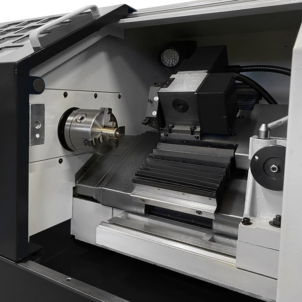 Il mandrino, del tipo autocentrante a 3+3 griffe, ha un diametro di Ø 100 mm ed è supportato da cuscinetti di alta precisione: è azionato da un motore in corrente continua da ben 1000 W. La torretta portautensile è motorizzata ed ha 8 posizioni (4 per interni + 4 per esterni): può ospitare utensili da taglio dalle dimensioni massime di 12 mm.