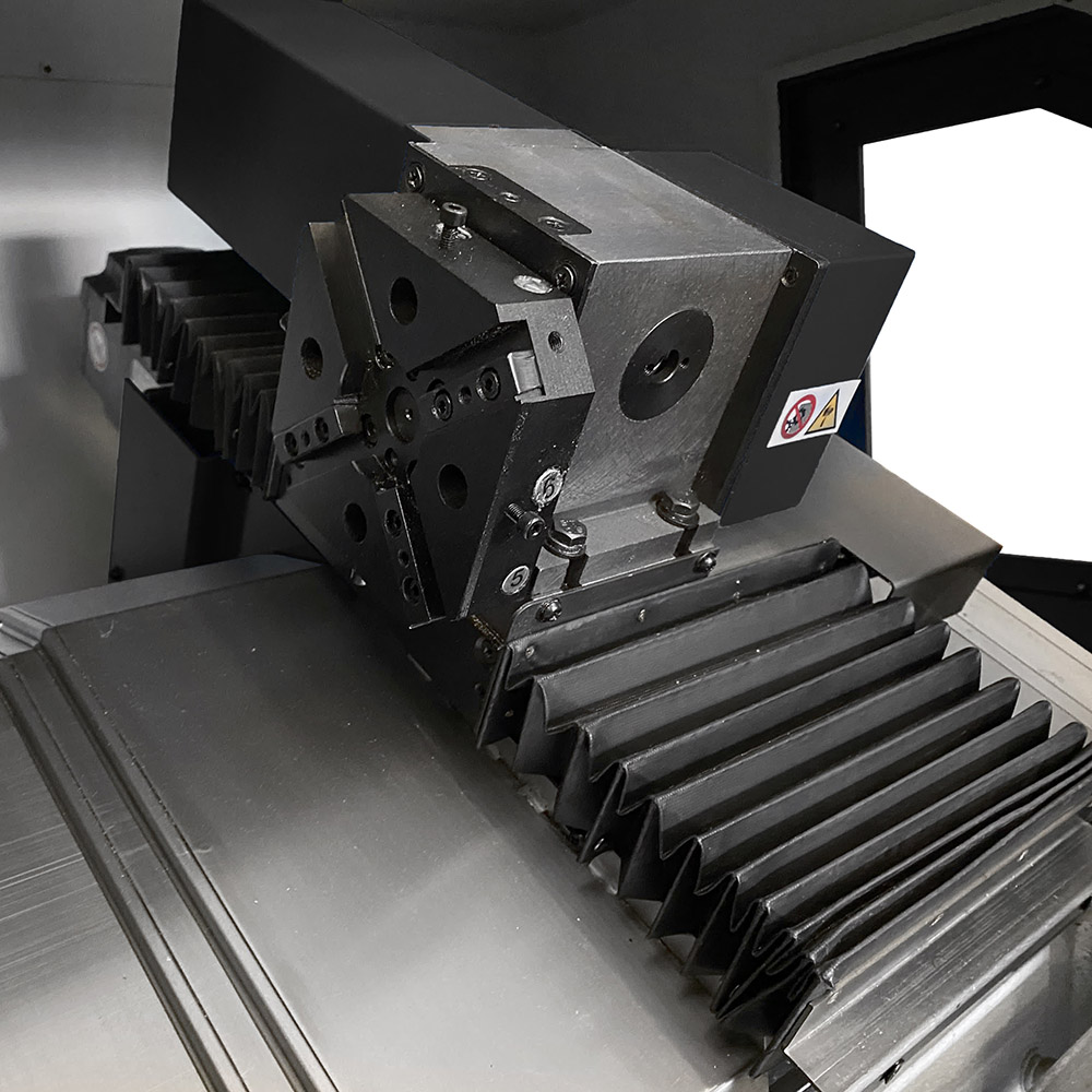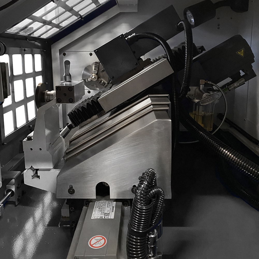 Il carro scorre lungo apposite guide lineari con pattini a ricircolo di sfere temprate e rettificate, mentre il bancale è inclinato di 45° per facilitare le operazioni di carico/scarico pezzo, evacuazione dei trucioli e gestione del refrigerante (OPTIONAL: impianto di lubrorefrigerazione). Gli assi sono azionati da servomotori sincroni a magneti permanenti controllati da azionamenti SIEMENS. Tale configurazione garantisce performance senza eguali in termini di velocità e accuratezza del posizionamento, assicurando un’elevata ripetibilità nel tempo.