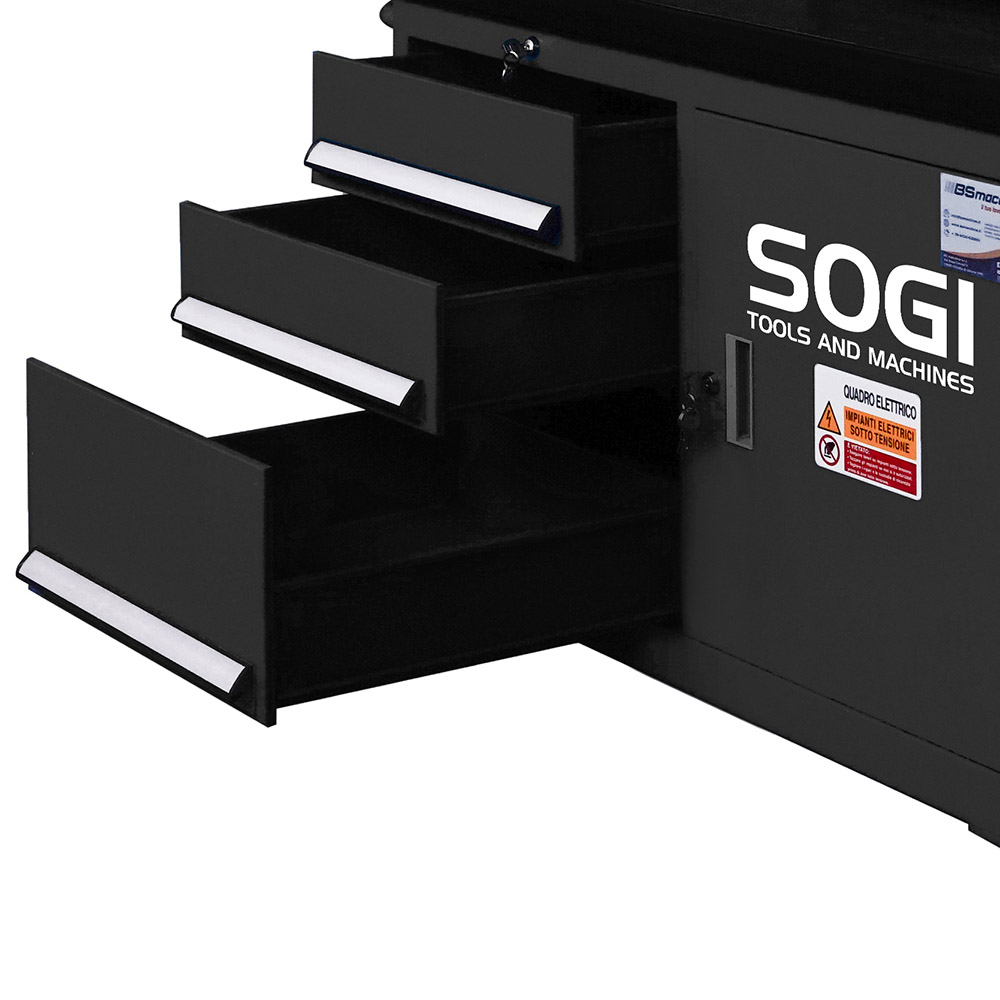 La macchina è equipaggiata di lampada LED ed impianto di lubrificazione ad azionamento manuale. Inoltre la macchina poggia su un basamento in lamiera mobile con tre cassetti dotati di chiusura centralizzata per stoccare attrezzi e utensili necessari alla lavorazione. Le quattro ruote pivotanti provviste di sistema frenante, insieme alla pratica ed ergonomica maniglia laterale, facilitano il trasporto della macchina da una zona all'altra.