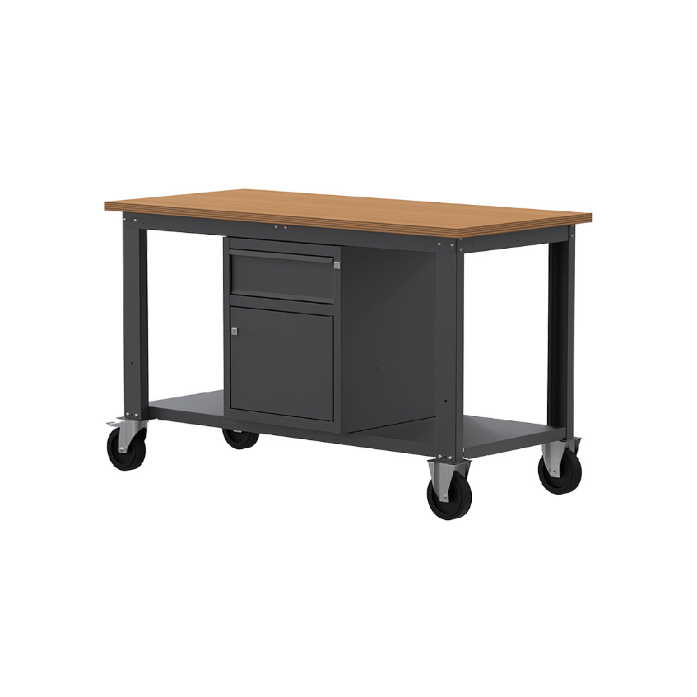 Banco da lavoro con ruote SOGI X3N_103LR - 1.5 m - piano in legno - armadio con anta e cassetto