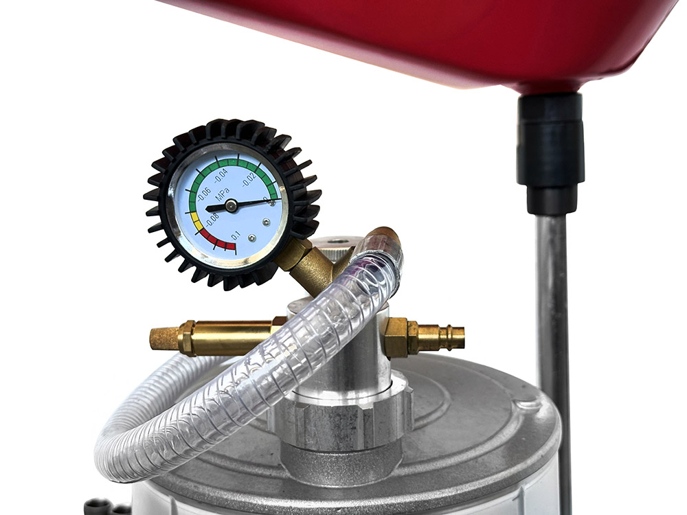 • Serbatoio del vuoto da 9 litri in policarbonato trasparente, con scala graduata, manometro per il controllo della depressione e valvola di sfiato dell'aria compressa.