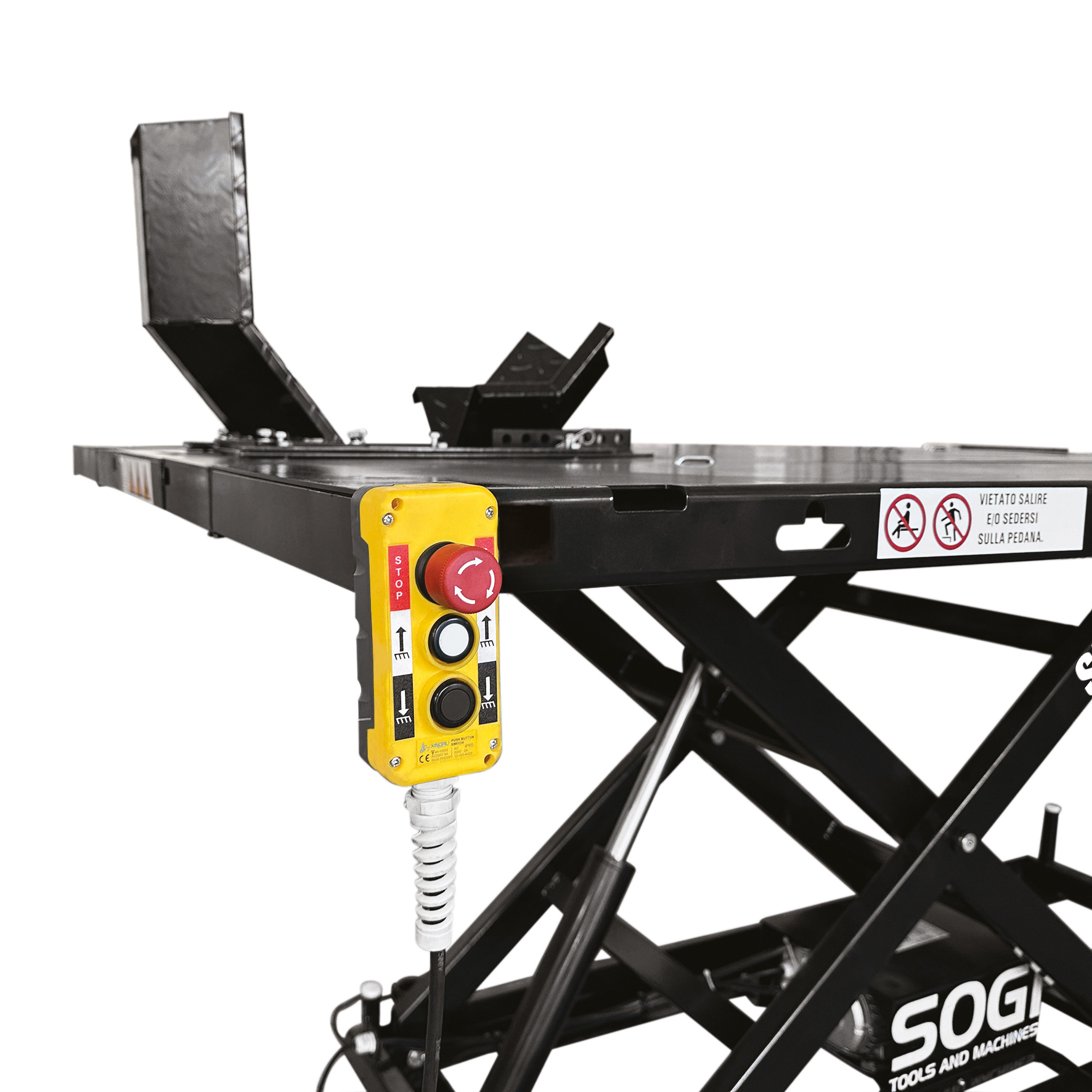 Il ponte sollevatore elettroidraulico a pantografo per moto SOGI SLE-01 è la soluzione ideale per officine, centri assistenza e appassionati del fai-da-te che cercano massima praticità, sicurezza e precisione durante le operazioni di manutenzione. Grazie al sistema elettroidraulico e al telecomando di controllo, la movimentazione della piattaforma è rapida, fluida e sicura. Il telecomando è dotato di pulsante di emergenza per un arresto immediato in condizioni di sicurezza.