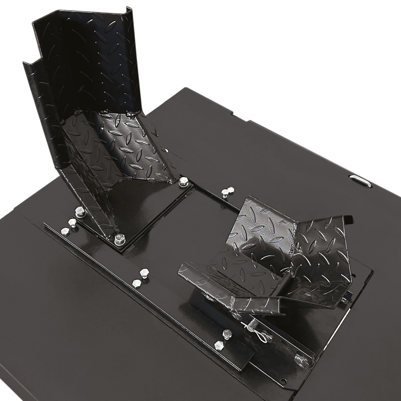 L’ampia rampa posteriore antiscivolo, amovibile e robusta, facilita l’accesso del veicolo alla piattaforma, garantendo aderenza e sicurezza. Completano la dotazione una morsa bloccaruota anteriore traslabile e regolabile su 7 posizioni, adatta a diversi diametri di pneumatici, e un sistema di sgancio rapido per una gestione semplice e veloce del serraggio.