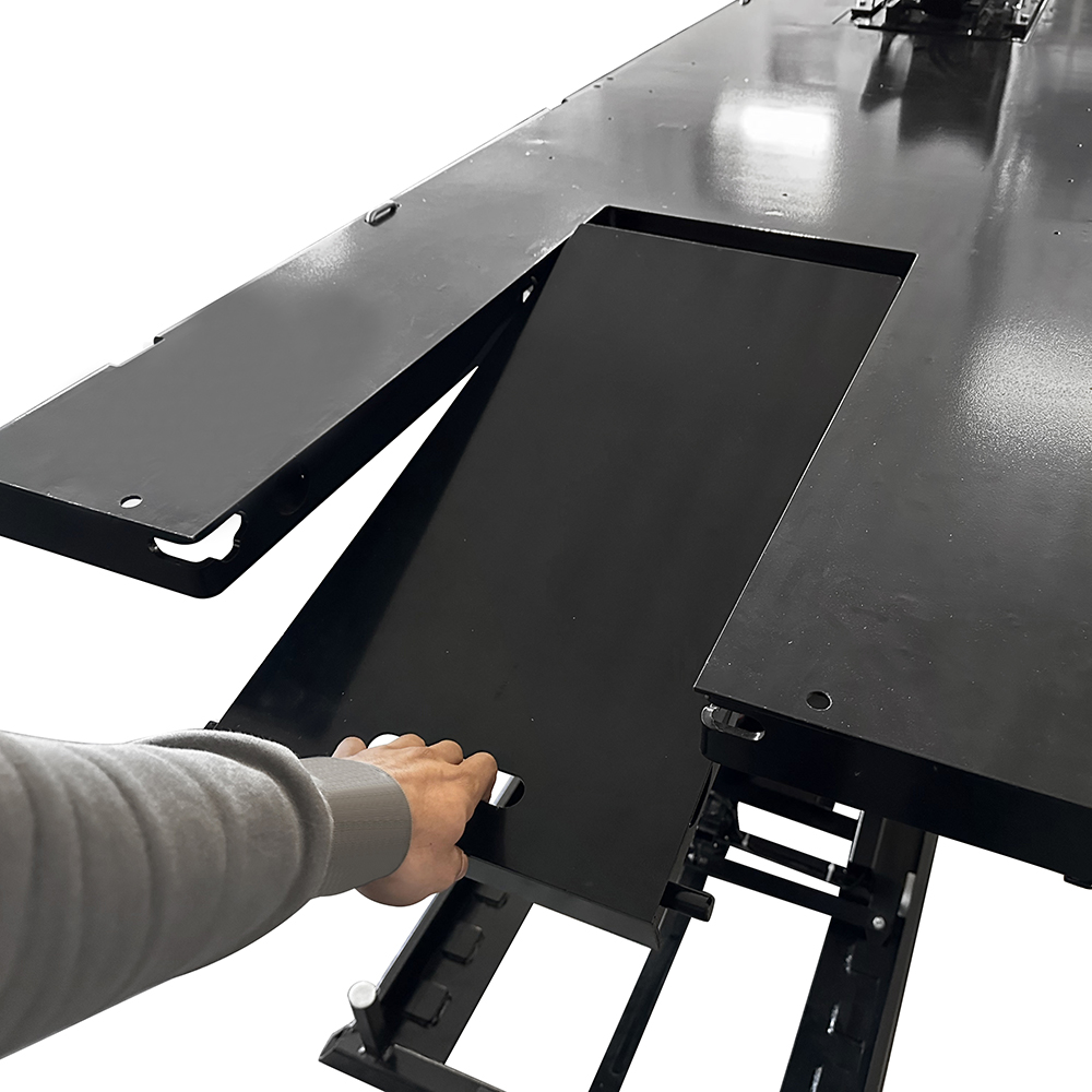 Dotato di quattro posizioni di bloccaggio meccaniche, assicura una perfetta stabilità durante le operazioni di manutenzione e riparazione. Le due pedane laterali amovibili ampliano la superficie di lavoro, permettendo di operare con la massima comodità anche su veicoli di grandi dimensioni.