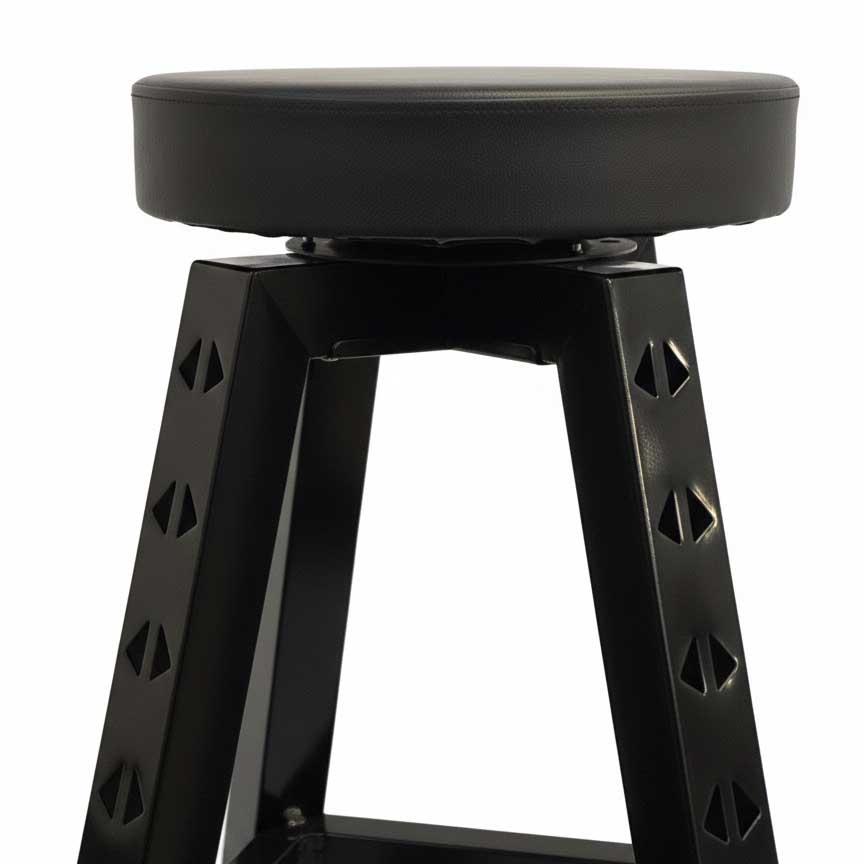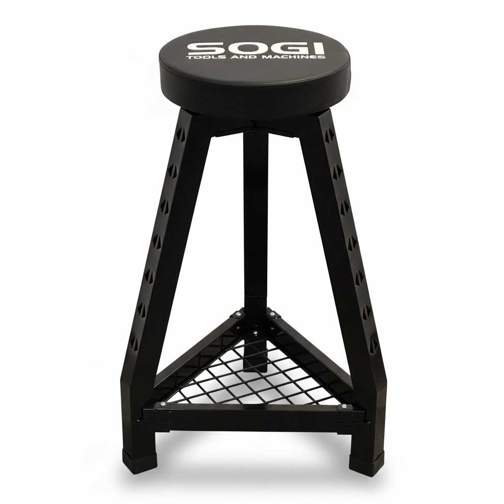 Sgabello alto da officina a 3 gambe SOGI X4-18 - portata 150 kg - griglia inferiore - seduta girevole - nero lucido