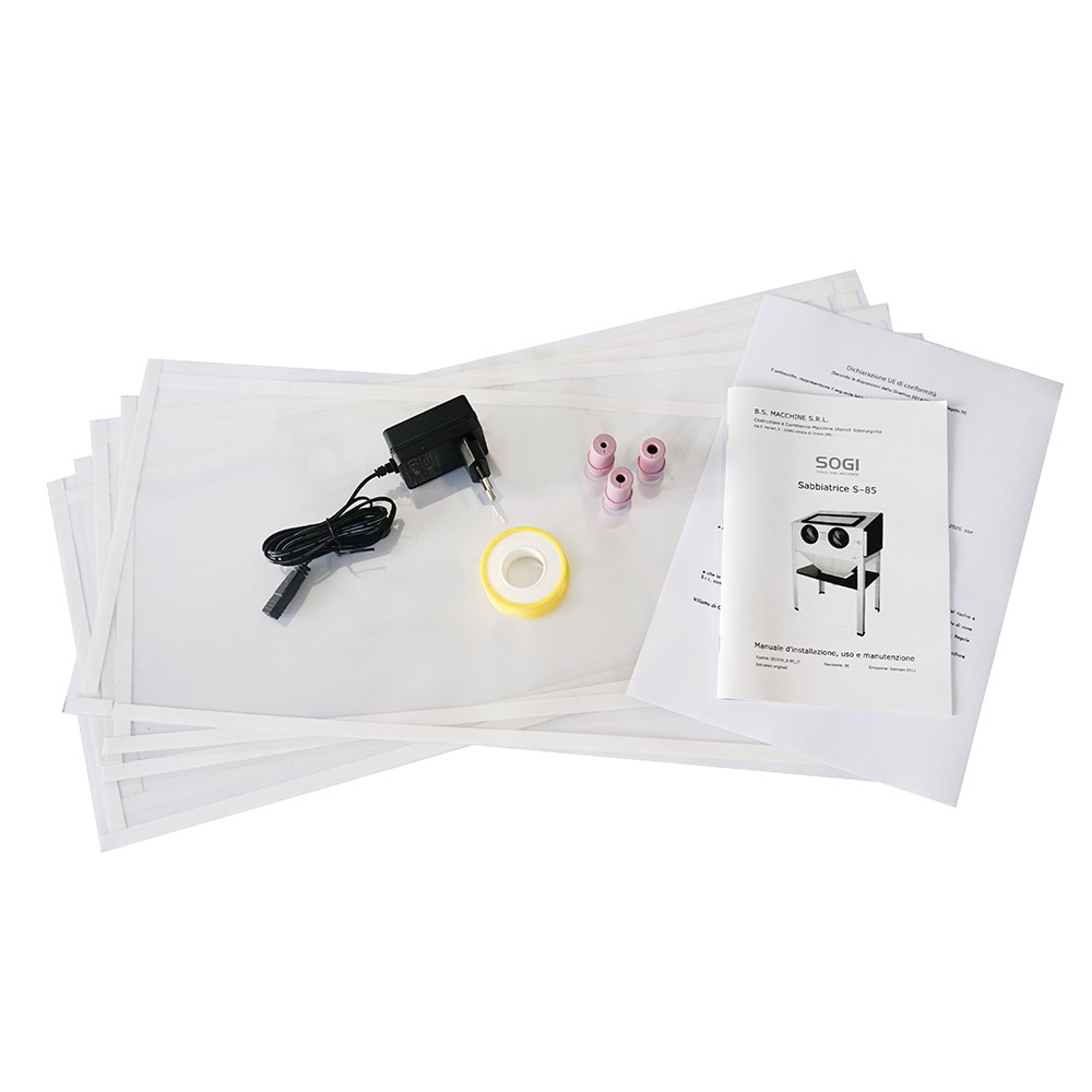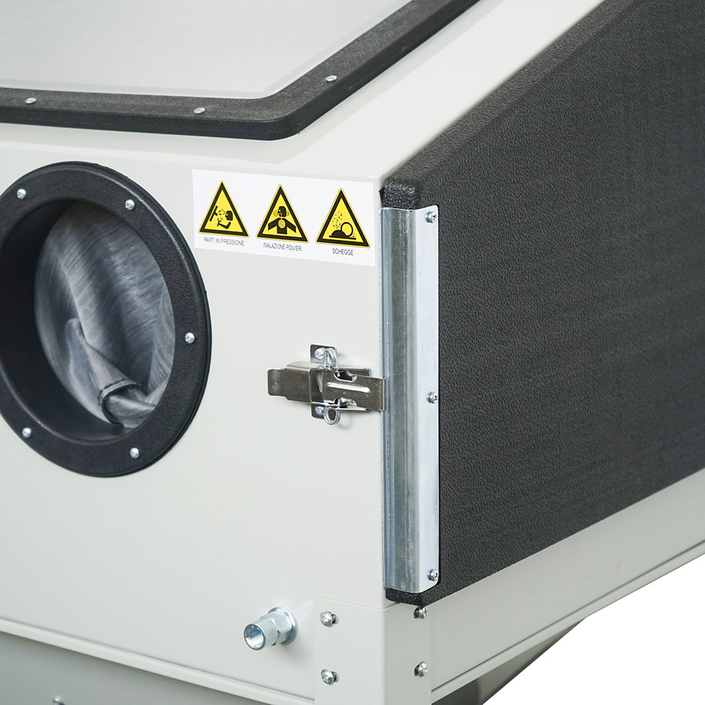 La sabbiatrice SOGI S-85 è una macchina professionale dotata di impianto di illuminazione interna, modello con singola apertura laterale. La macchina è dotata di certificazione a norma CE.
