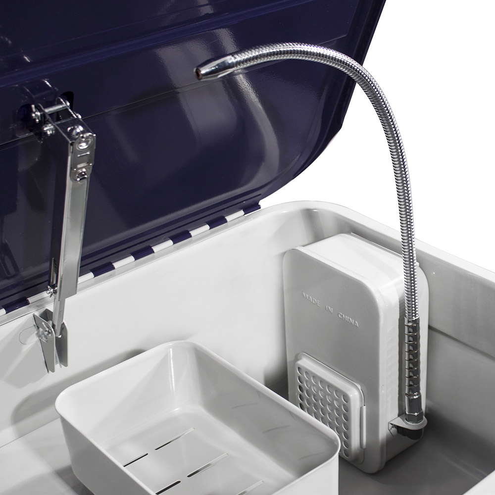 La vasca lavapezzi mobile SOGI SP-LV-ER  è dotata di pompa a recupero con pratico ugello orientabile è tubo con pennello aggiuntivo, ideale per il lavaggio di carter di motori, particolari, strumenti d'officina, pezzi vari che necessitano la pulizia. Comprende un ripiano forato per lo sgocciolamento del pezzo, asportabile per i pezzi da lavare più ingombranti ed una vaschetta per i particolari più piccoli.
