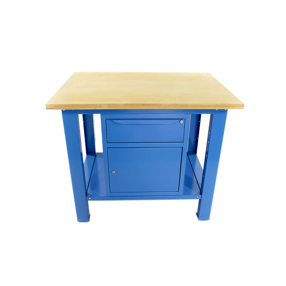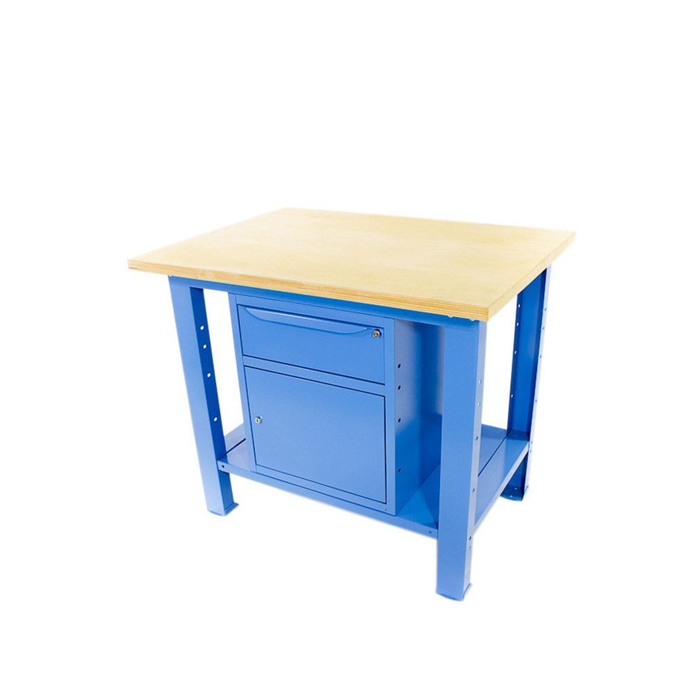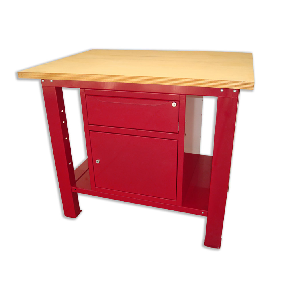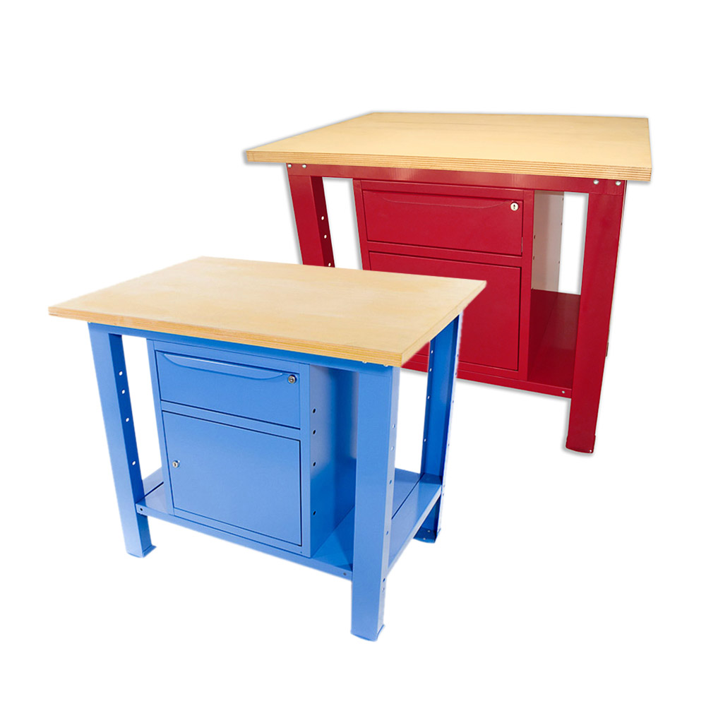 Banco da lavoro SOGI 1 metro con piano in legno + armadio con anta e cassetto - blu/rosso