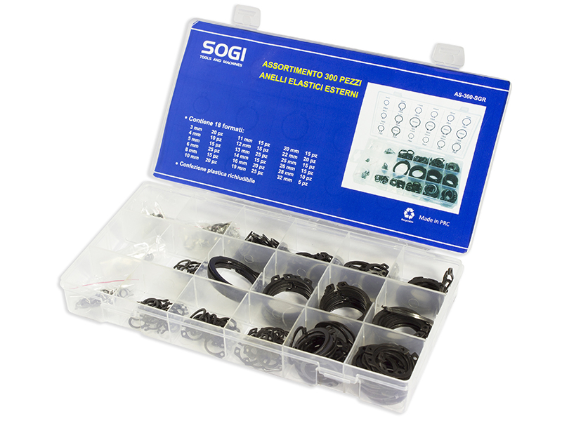 ASSORTIMENTO SET SERIE DI 300 ANELLI ELASTICI SEEGER PER ALBERI ESTERNI SOGI AS-300-SGR