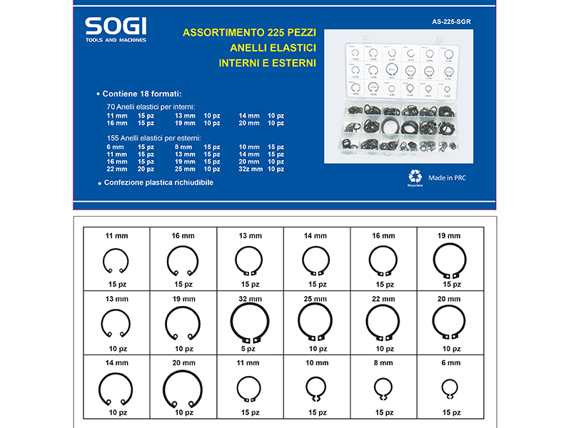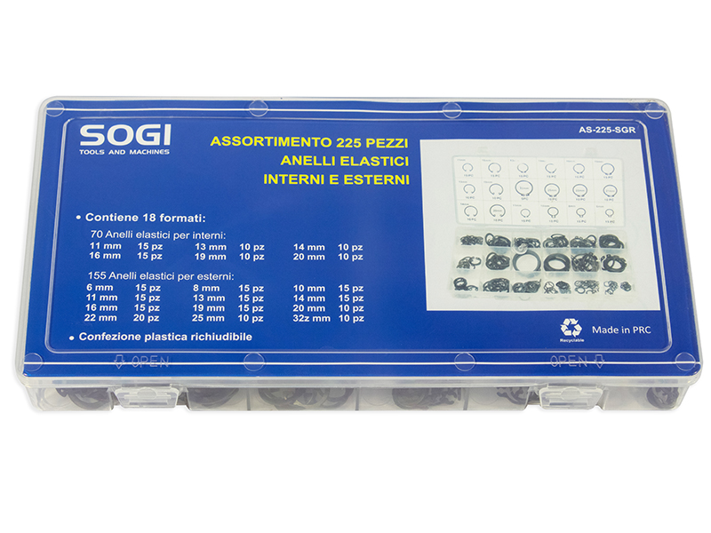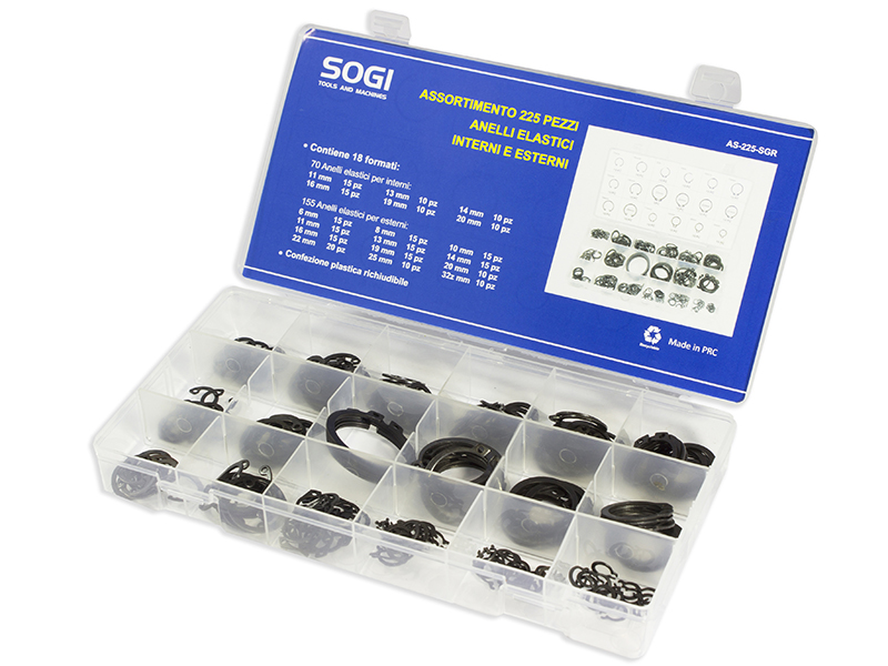 ASSORTIMENTO SET SERIE DI 225 ANELLI ELASTICI SEEGER PER INTERNI E ESTERNI SOGI AS-225-SGR