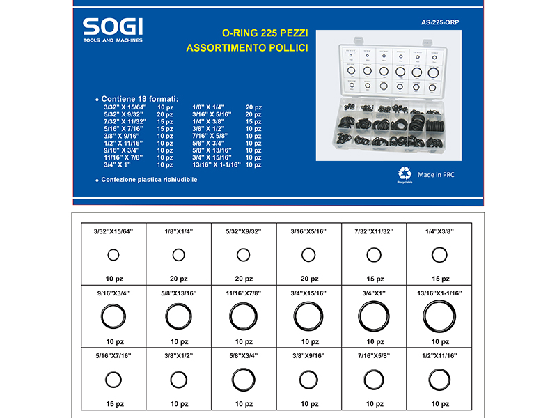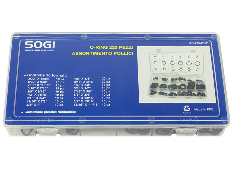 ASSORTIMENTO SET SERIE DI 225 OR ORING O-RING GUARNIZIONI IN POLLICI SOGI AS-225-ORP