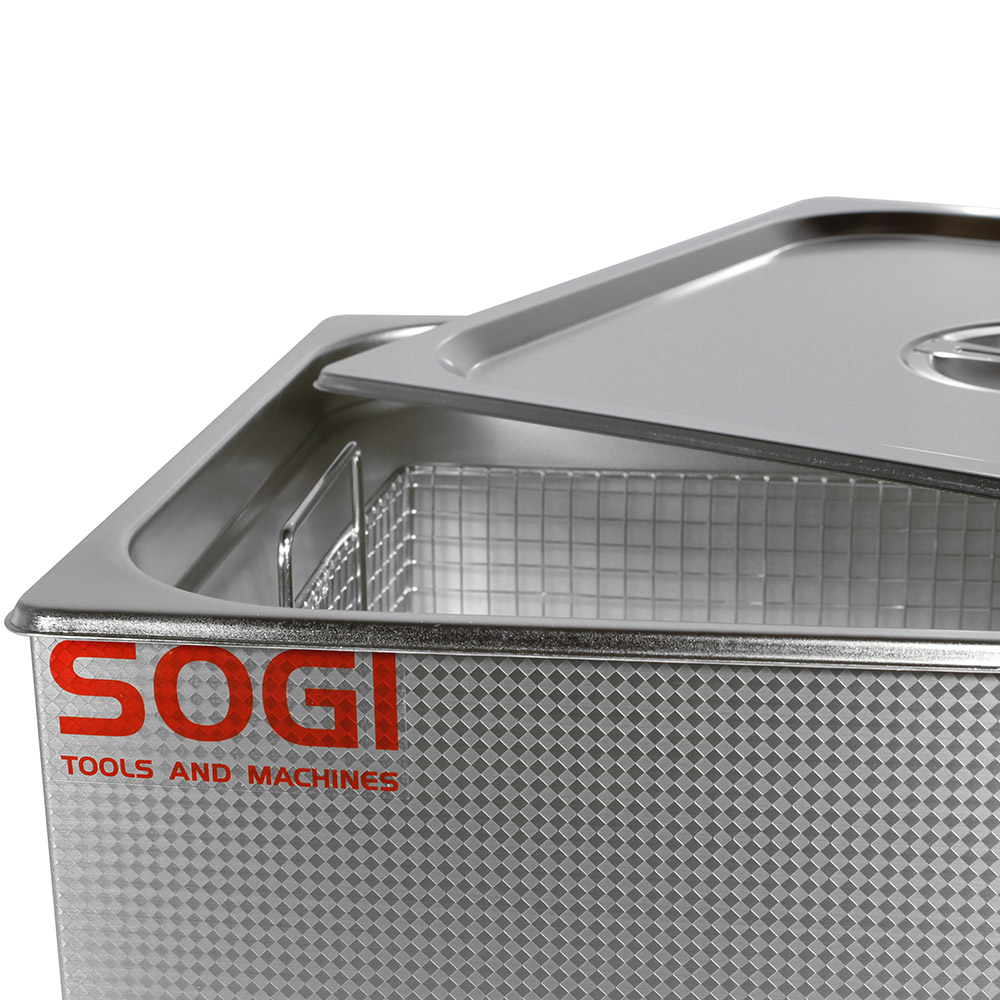 La vasca di lavaggio a ultrasuoni SOGI VL-U1000R è realizzata interamente in acciaio inox per contrastare la corrosione dei solventi o liquidi sgrassanti utilizzati durante il lavaggio dei pezzi. É inoltre dotata di riscaldamento con un massimo di 80° Celsius. Predisposta di ventola di raffreddamneto per il sistema di alimentazione.